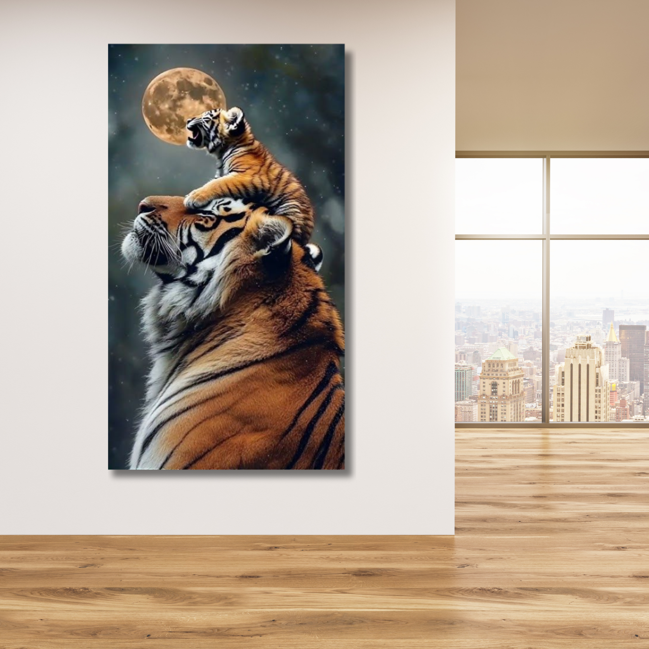 Tigre adulto y cachorro a la luna